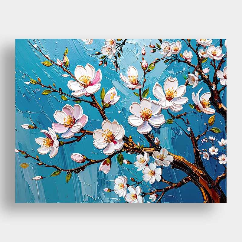 Ilustración de un bonito almendro en flor sobre fondo turquesa.