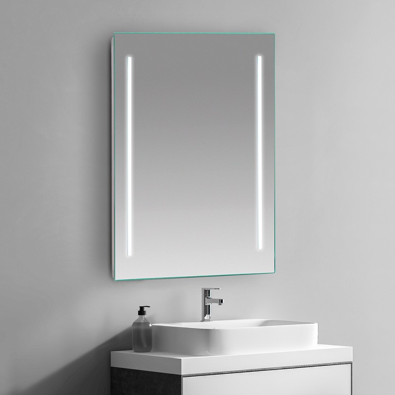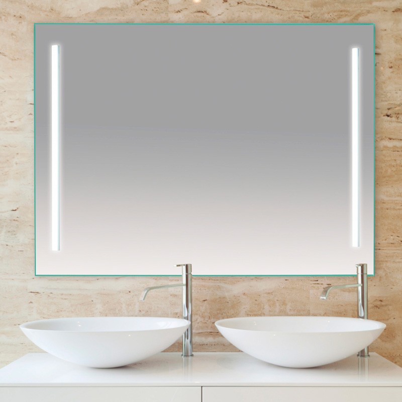 - Espejo de forma rectangular con luz LED frontal y canto pulido.