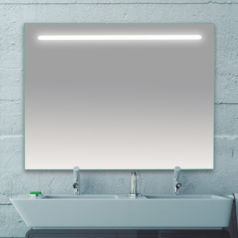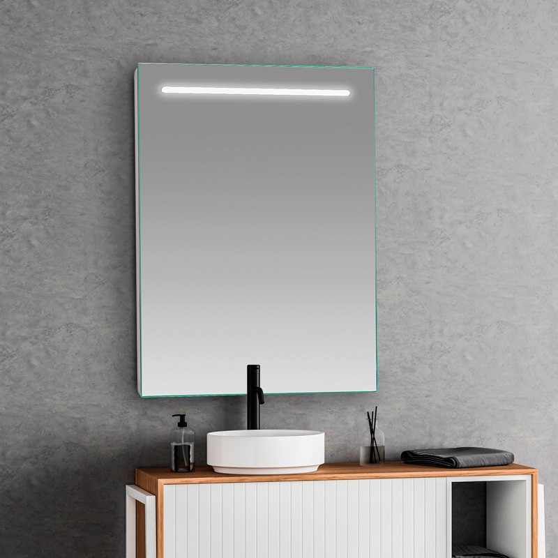 - Espejo de forma rectangular con luz LED frontal y canto pulido.