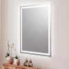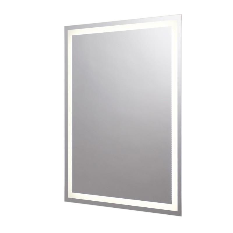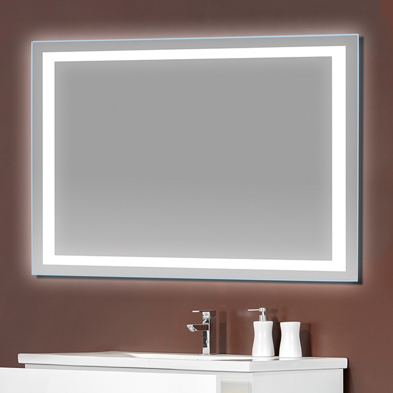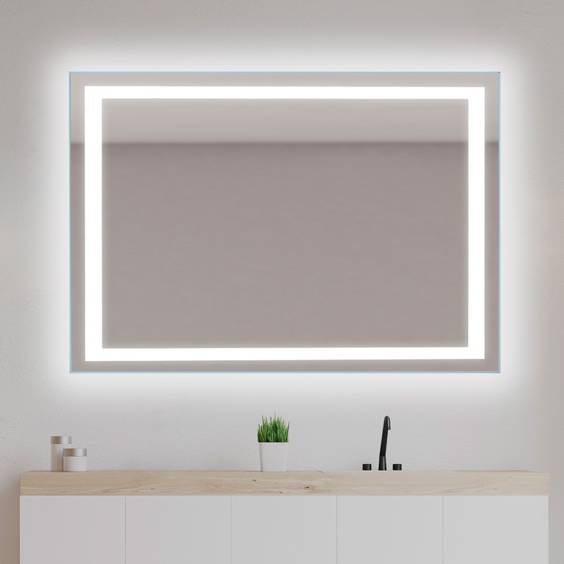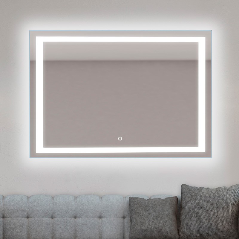 Espejo rectangular retroiluminado LED con canto pulido y pulsador táctil integrado en el espejo.