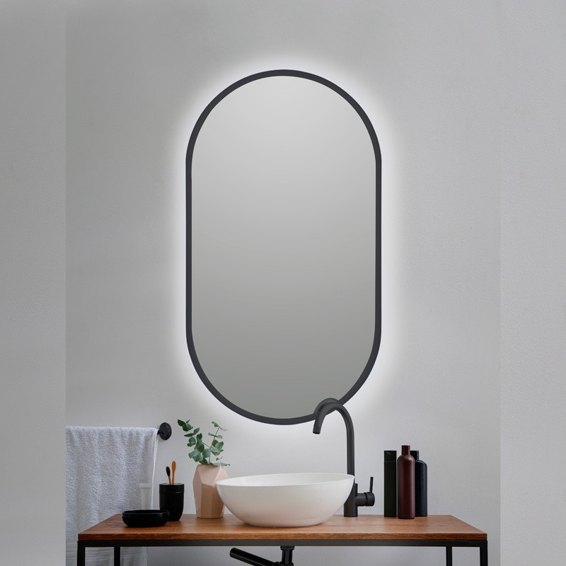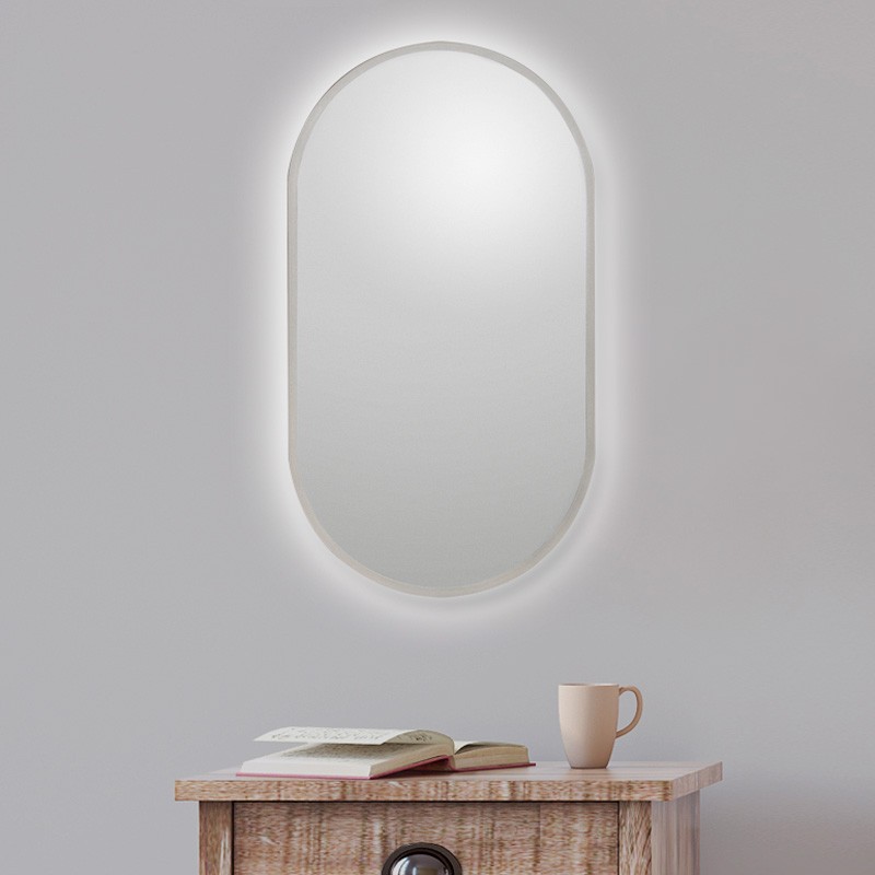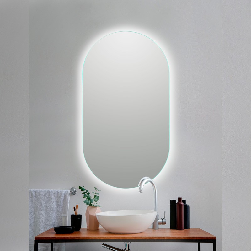 - Espejo de forma ovalada retroiluminado con luz led con pulsador táctil.
