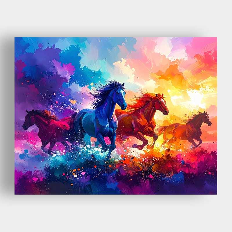 Ilustración fantasiosa de un grupo de caballos de colores.