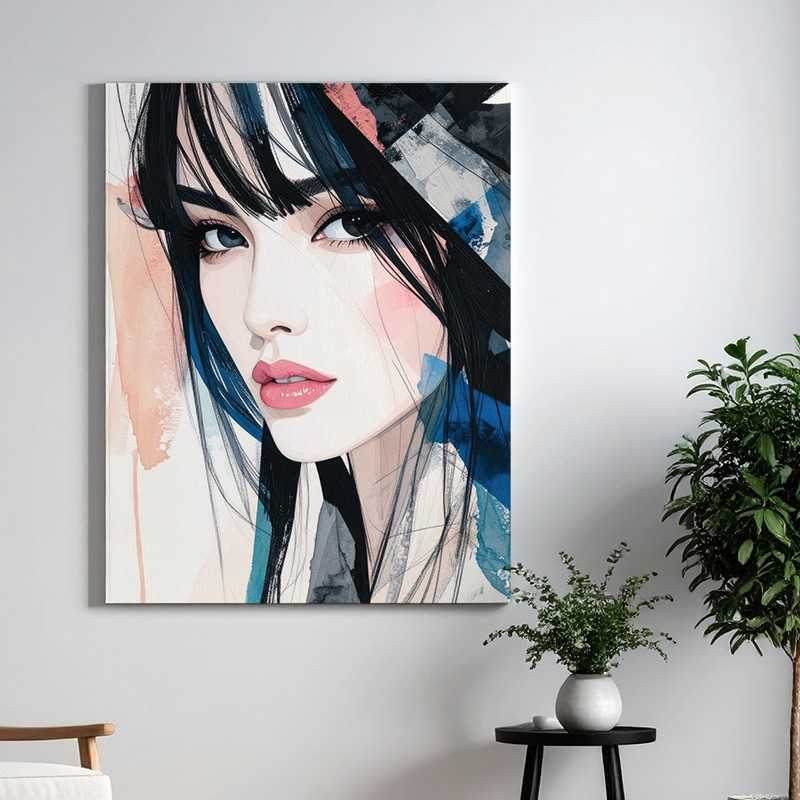 Ilustración estilo acuarela japonesa de mujer con mirada penetrante.