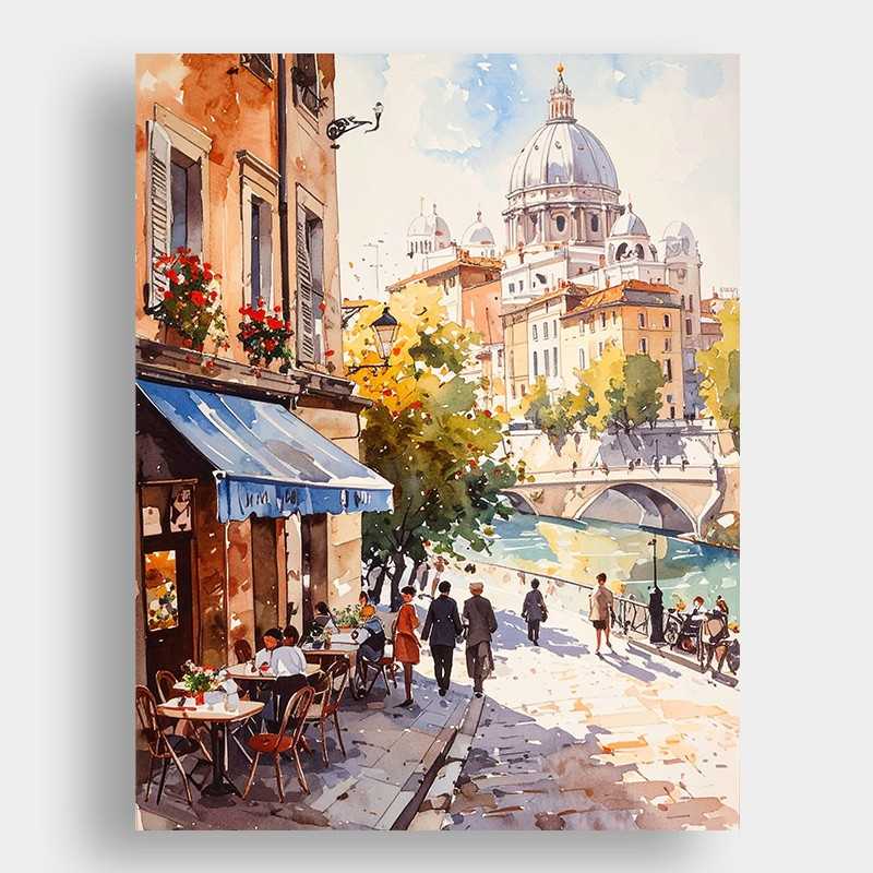 Ilustración de una hermosa calle de Italia con gente paseando.