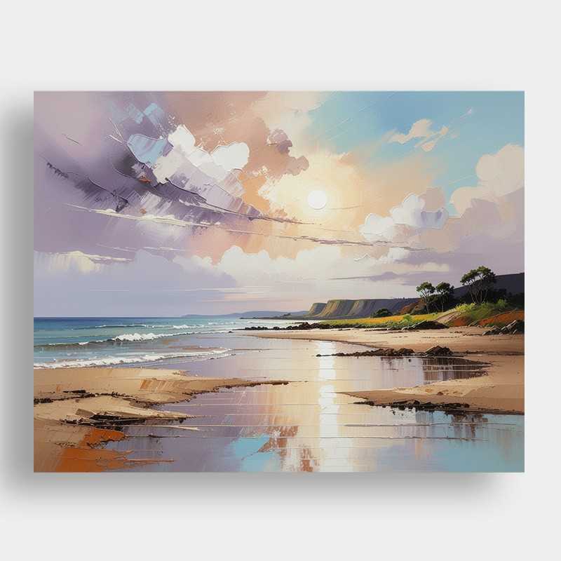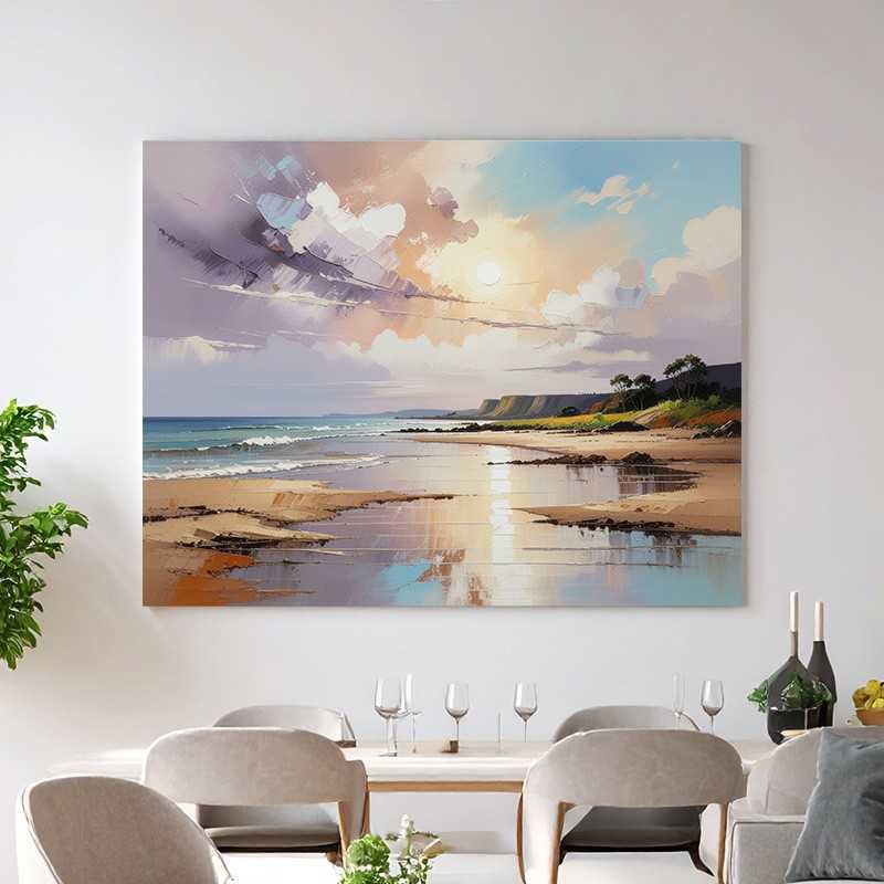 Paisaje de una tranquila playa al atardecer en estilo pictórico al oleo.