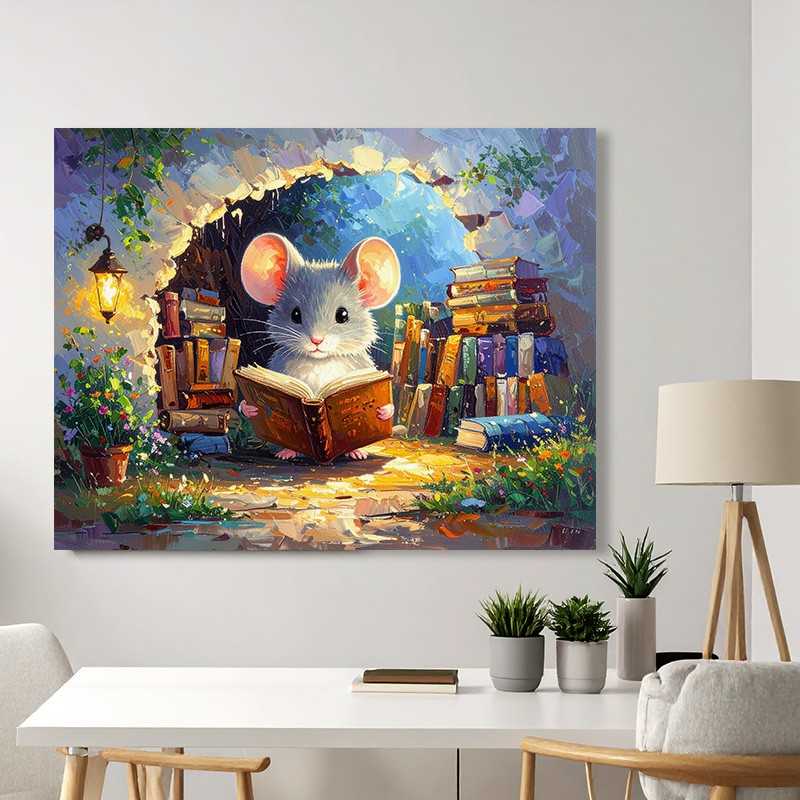 Bella ilustración de cuento de un ratoncito leyendo un libro.